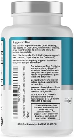 Clinically Researched Strains — A powerful blend of dental probiotics packed with 7 potent strains of probiotics: the patented BLIS K12 and BLIS M18, Lactobacillus Acidophilus, Lactobacillus Reuteri, Lactobacillus Salivarius, Lactobacillus Paracasei, Lactobacillus Thermophilus, and Streptococcus Salivarius.